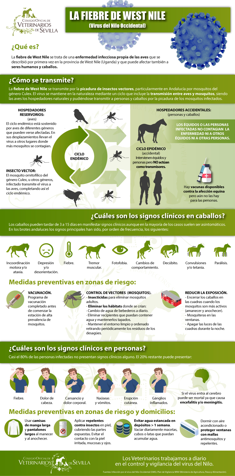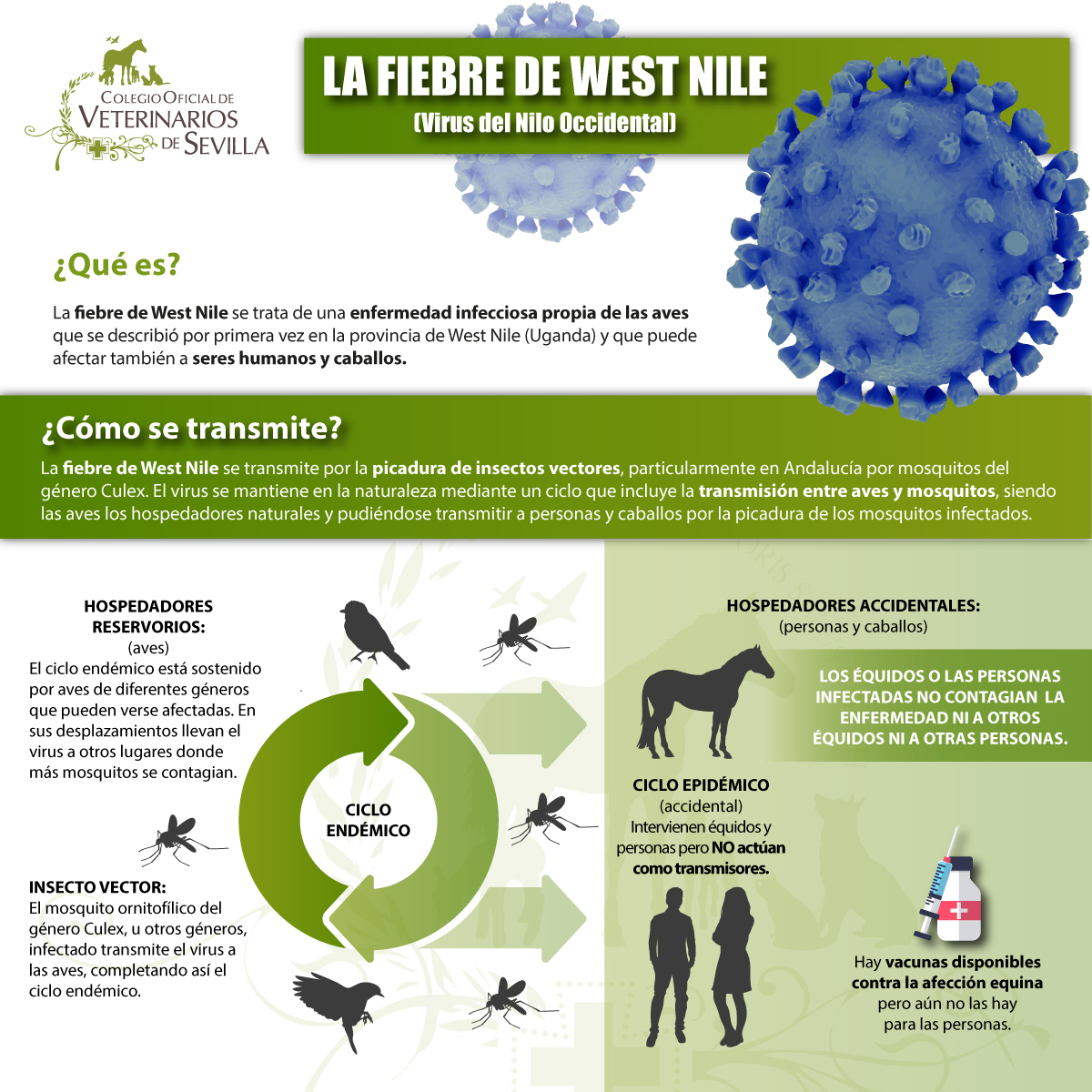 Se transmite por la picadura de insectos vectores, particularmente en Andalucía por mosquitos del género Culex. El virus se mantiene en la naturaleza mediante un ciclo que incluye la transmisión entre aves y mosquitos, siendo las aves los hospedadores naturales y pudiéndose transmitir a personas y caballos por la picadura de los mosquitos infectados