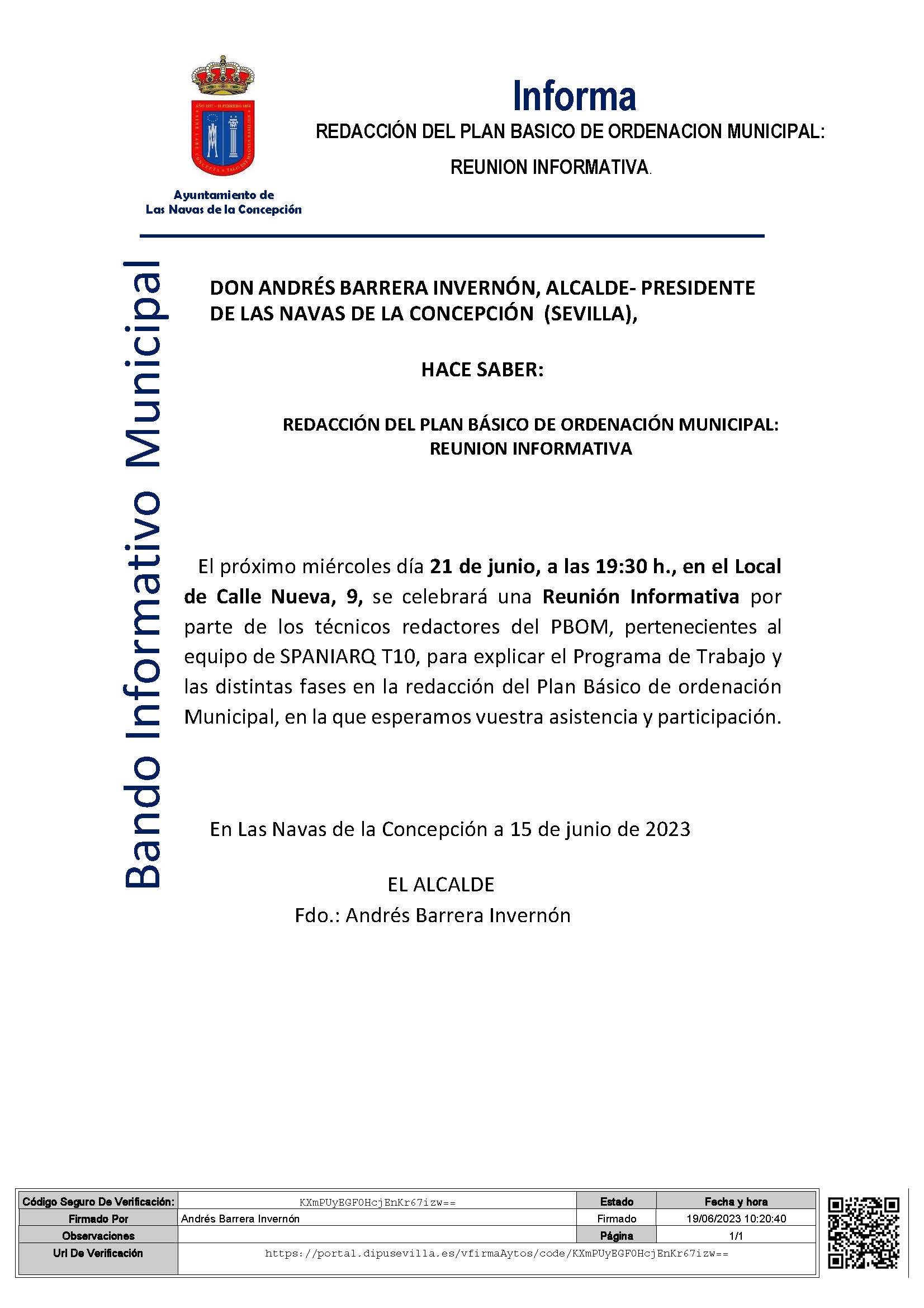 Reunión Informativa por parte de los técnicos redactores del PBOM, pertenecientes al equipo de SPANIARQ T10, para explicar el Programa de Trabajo y las distintas fases en la redacción del Plan Básico de ordenación Municipal, en la que esperamos vuestra asistencia y participación