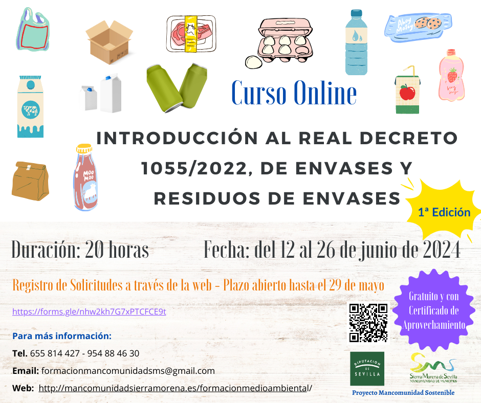 Dentro del proyecto Mancomunidad Sostenible le informamos que desde hoy y hasta el próximo 29 de mayo se abre el periodo de solicitud de la acción formativa "Introducción al R.D 1055/2022 de Envases y Residuos de envases" 1ª Edición, con una duración de 20 horas e impartida en modalidad Online del 12 al 26 de junio de 2024 (se adjunta Ficha Técnica con los datos del curso).