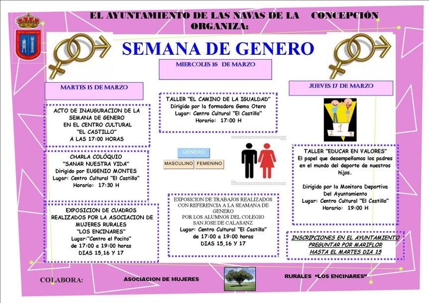 Enmarcada en la celebración del Día de la Mujer, el Ayuntamiento de Las Navas de la Concepción con la colaboración de la Asociación de Mujeres Rurales Los Encinares y el C.P. San José de Calasanz quieren unirse a esta conmemoración organizando durante los días 15, 16 y 17 de marzo la "Semana de Género 2011" en el Centro Cultural "El Castillo". Se han organizado una serie de actividades (exposiciones, conferencias, charlas-coloquio, talleres) cuya temática tiene que ver con este género humano luchador, deseando, así, hacer un guiño a todas las mujeres. Por un lado, se podrá disfrutar, durante los tres días, de la exposición de cuadros de pintura organizada por la Asociación de Mujeres Rurales Los Encinares, en el mismo lugar los alumnos y alumnas del C.P. San José de Calasanz presentan sus trabajos con la temática "8 de marzo, Día Internacional de la Mujer" que nos sorprenderán con sus creaciones. El martes 15, se inaugura la Semana de Género a las 17:00 horas. A las 17:30 tendrá lugar la charla-coloquio "Sanar nuestra vida" dirigida por Eugenio Montes. El miércoles 16, participaremos en el taller que lleva por título "El camino de la igualdad" que dirigirá la formadora social Gema Otero alas 17:00 horas. El jueves 17, la monitora deportica Mª Carmen Berro nos presentará el taller "Educar en valores" a las 19:00 h. Tras dicho taller se clausuran las jornadas.